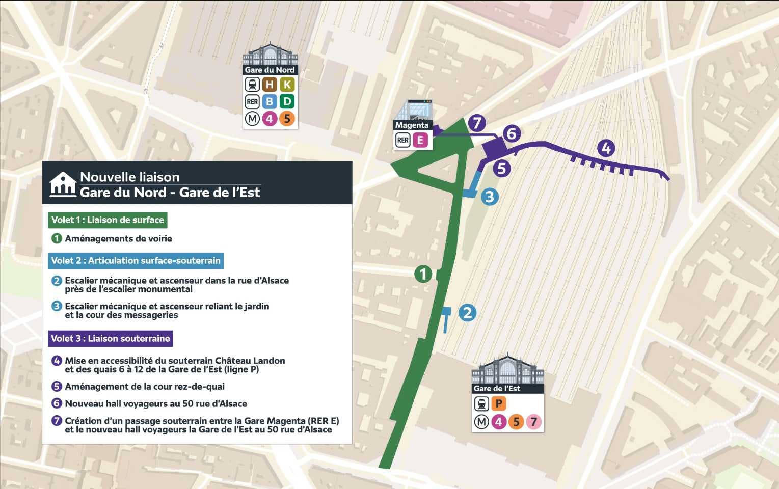 Situé au nord-est de Paris, dans le 10e arrondissement, le projet de liaison entre la Gare du Nord et la Gare de l’Est consiste à construire une véritable correspondance optimisée et accessible à tous, en surface et/ou en souterrain, entre les pôles Paris Nord (Gare du Nord - Magenta - La Chapelle) et Paris Est (Gare de l’Est - Château-Landon). Cette liaison mettra en relation directe tous les modes de transport et améliorera ainsi les temps de parcours.